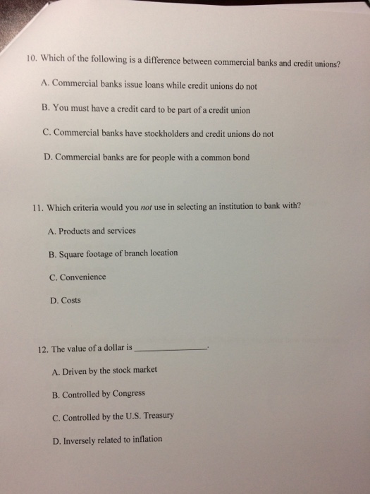 As you discuss the difference between commercial banks and credit unions (#1 & 2 on the Guided Reading Questions), give the students definitions for the 3 major types of private financial institutions. 1. Commercial banks-this is what people normally call a "bank". Commercial banks ... Get Document
